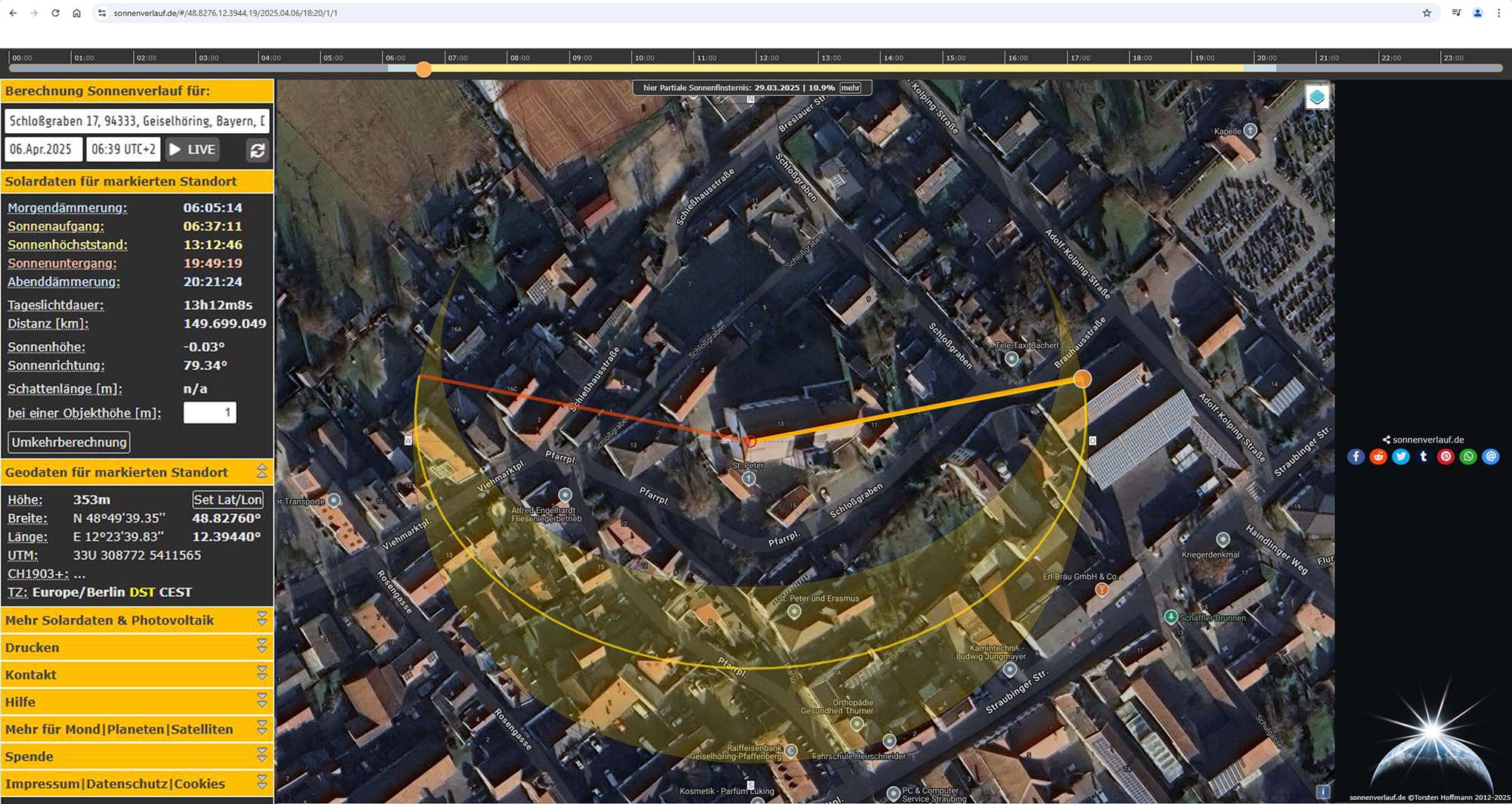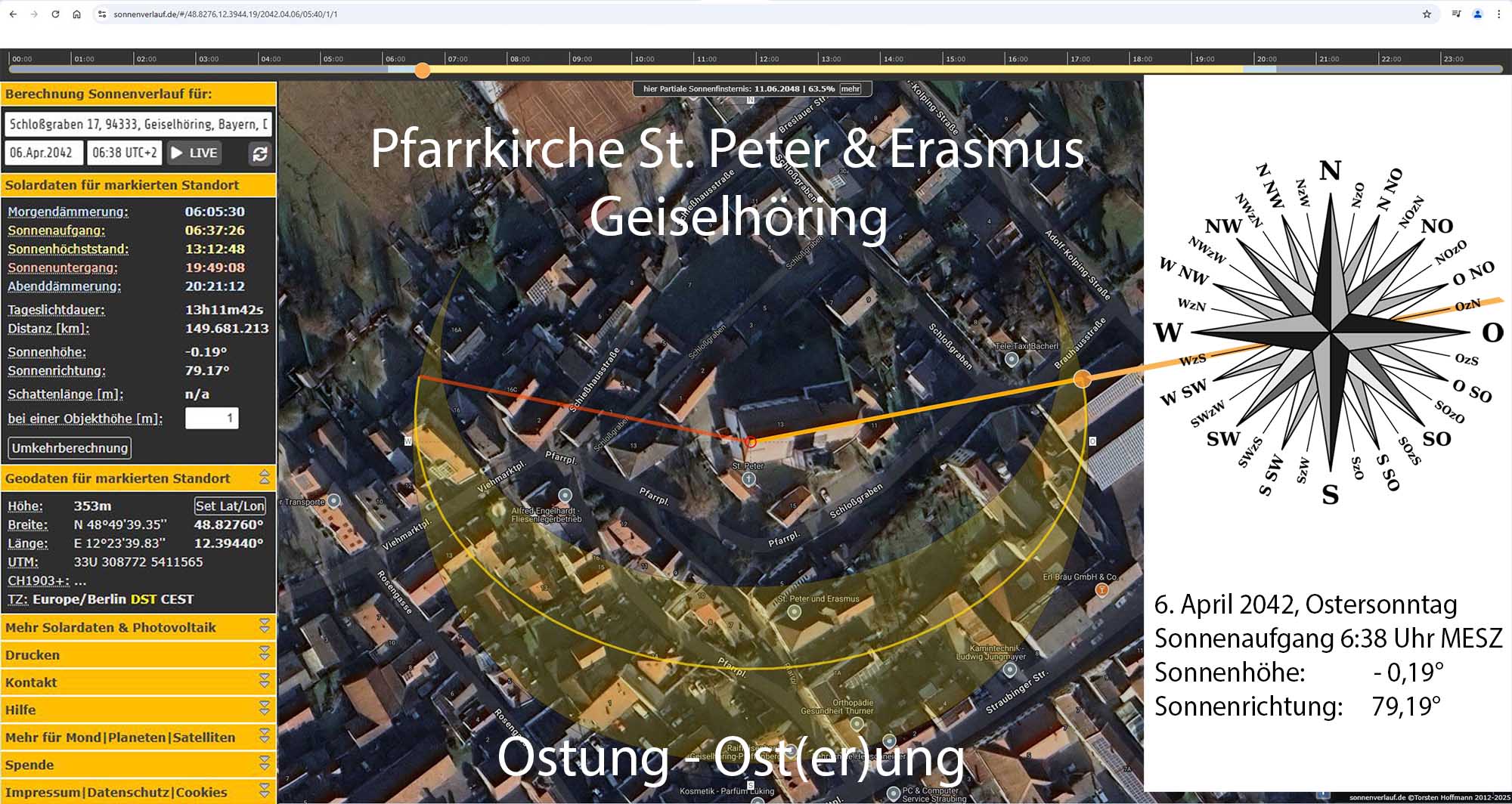 - Mittels dem Internetwerkzeug „www.sonnenverlauf.de“, anhand eines parallelen Abgleiches der Firstrichtung des Kirchendaches mit der Sonnenrichtung zum Sonnenaufgang am 06. April 2025 (Wert ca. 10,7 Grad). [Bild 2]