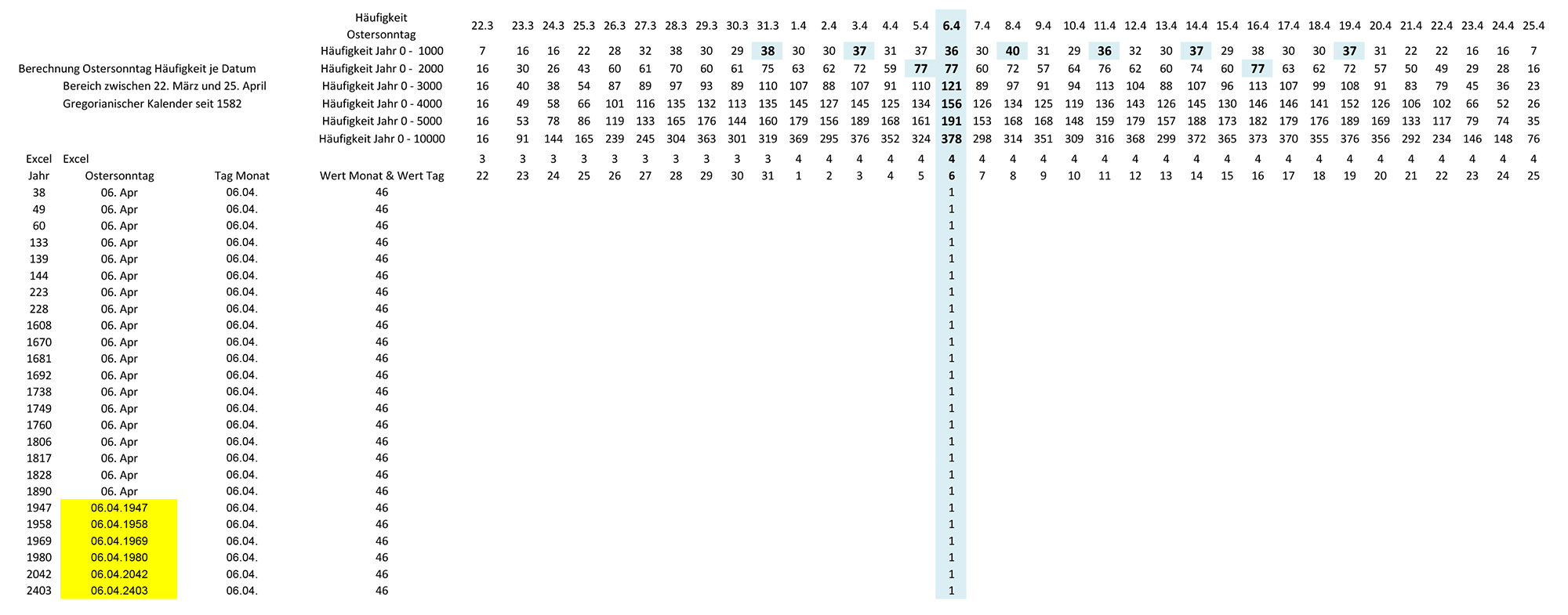 Der 6. April ist MIT DAS HÄUFIGSTE DATUM FÜR DEN OSTERSONNTAG und zwar in dem Zeitraum Jahr 1 – Jahr 2000 genau 77 Mal. Auch für den 5. April und den 16. April ergibt sich eine Häufigkeit von 77 Mal. [Bild 4]