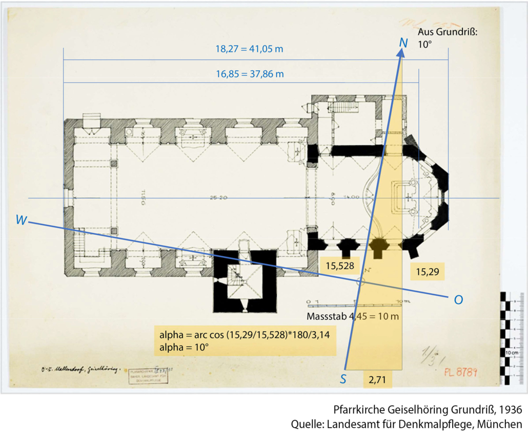 - Zeichnerisch und rechnerisch mit dem Grundriss der Pfarrkirche, einem Dokument vom Landesamt für Denkmalpflege aus dem Jahr 1936. Ein in den Nordpfeil eingezeichnetes rechtwinkeliges Dreieck ergibt – mit wirklich nicht zu überschätzender Genauigkeit – einen Wert für den Winkel von ca. 10 Grad. [Bild 1]