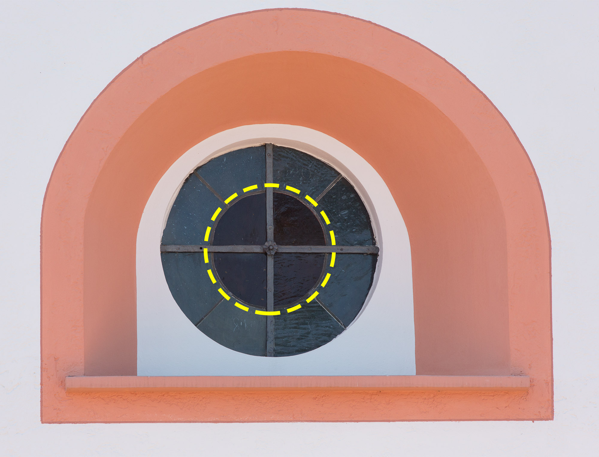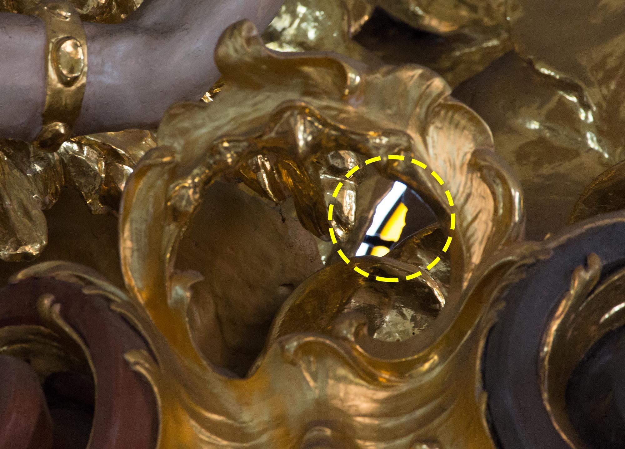 In der Nahaufnahme und einem entsprechenden Blickwinkel durch den Stuckrahmen ist deutlich das weiße und gelbe Fensterglas zu erkennen.