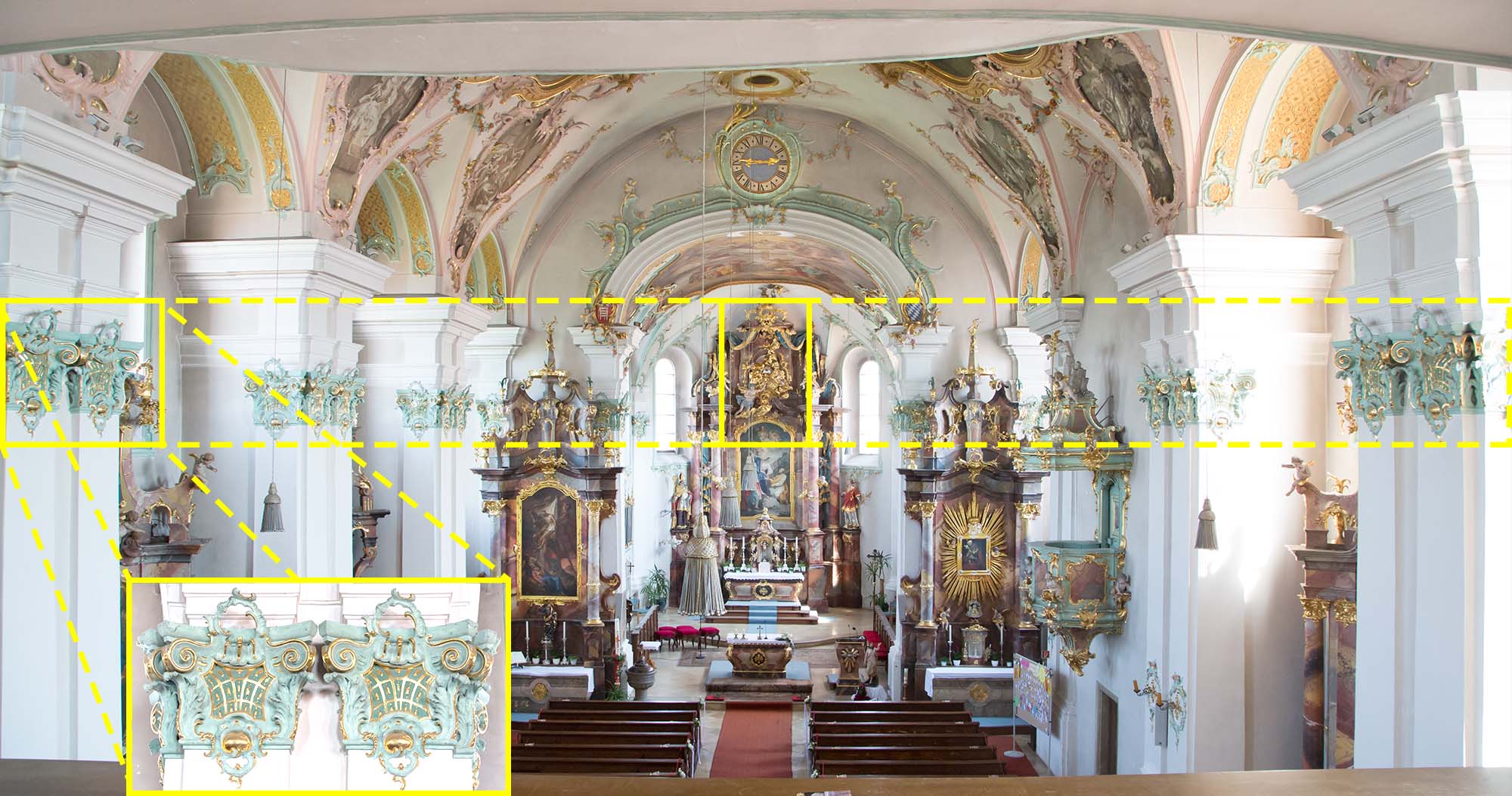 3. Diese Stuckrahmenform wiederholt sich aber auch noch zigfach im gesamten Kirchenschiff jeweils als Abschluss einer Säule: