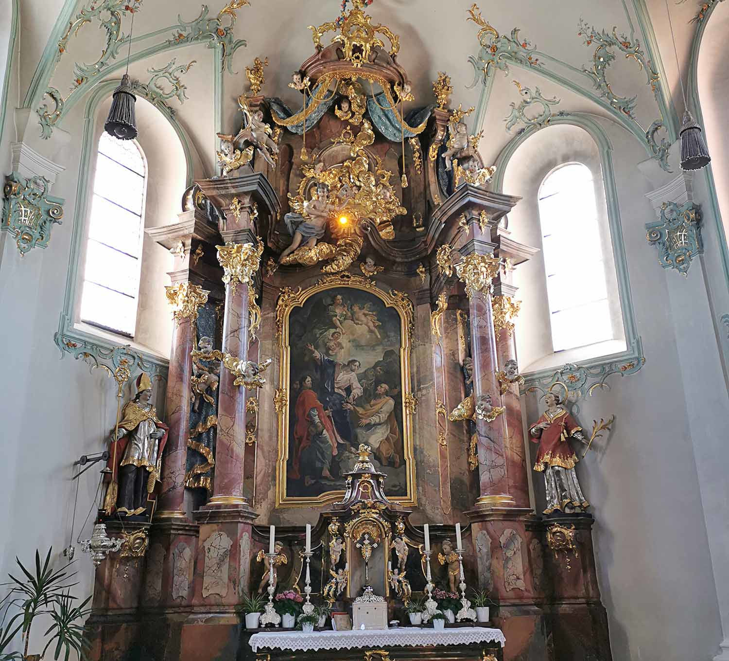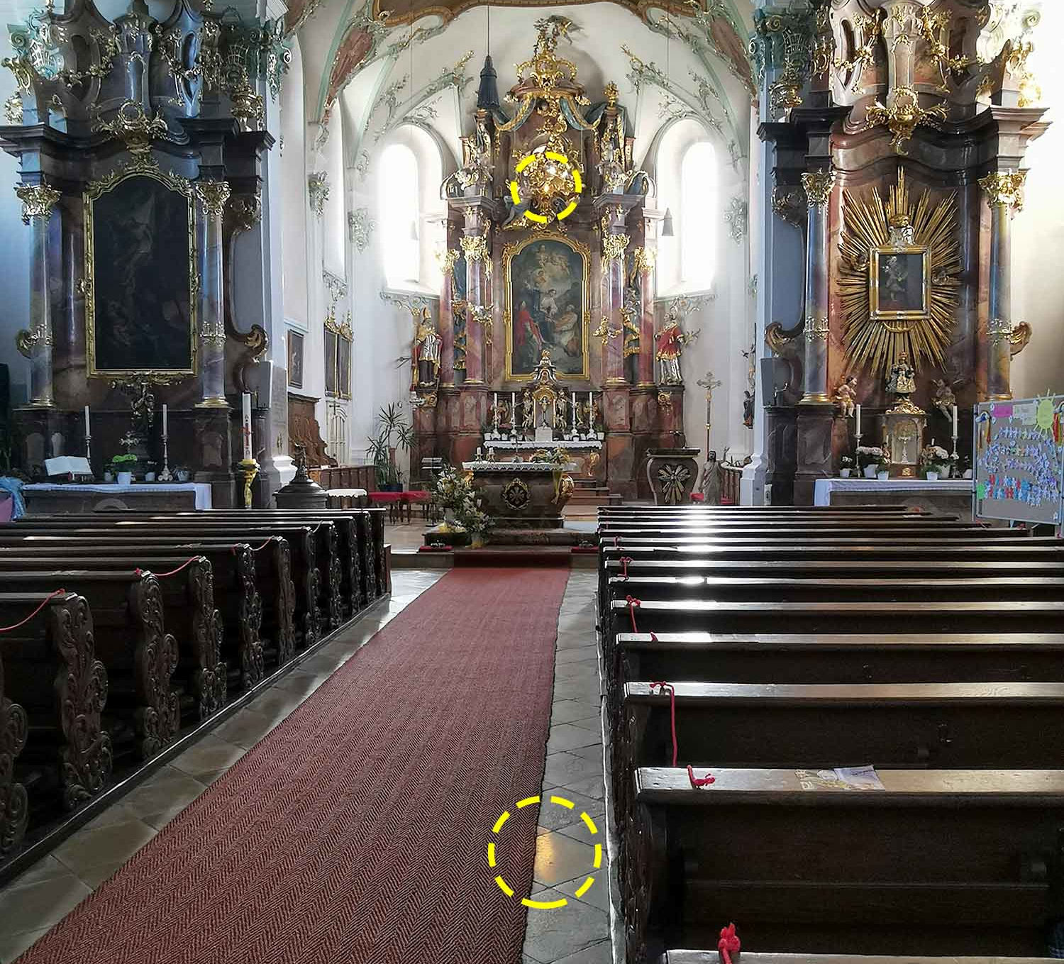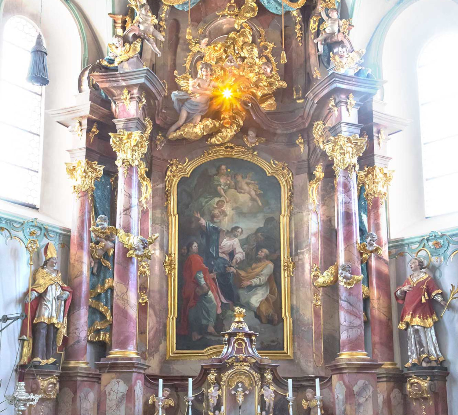 Ausgehend vom Hochaltar mit dem „Lichtspiel am Morgen“ fungiert er quasi als „Beleuchtung / Flutlicht“ für die gesamte Kirche.